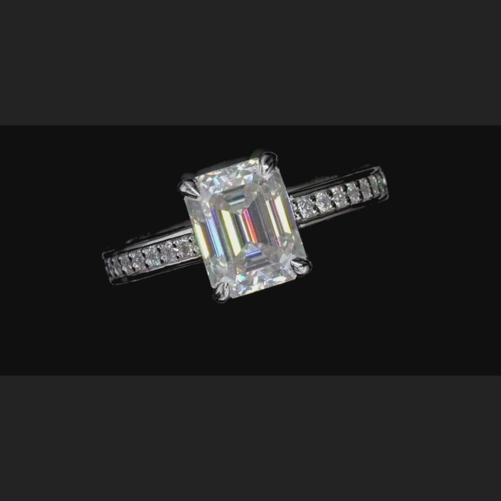 The centerpiece is a stunning 3 carat emerald-cut Moissanite stone, cut to perfection and featuring D-colourless and VVS1 clarity for exceptional sparkle. Complementing the centerpiece is a half pave channel setting adorned with smaller Moissanite stones (0.012 carats each), adding up to a total carat weight of 3.192 carats.